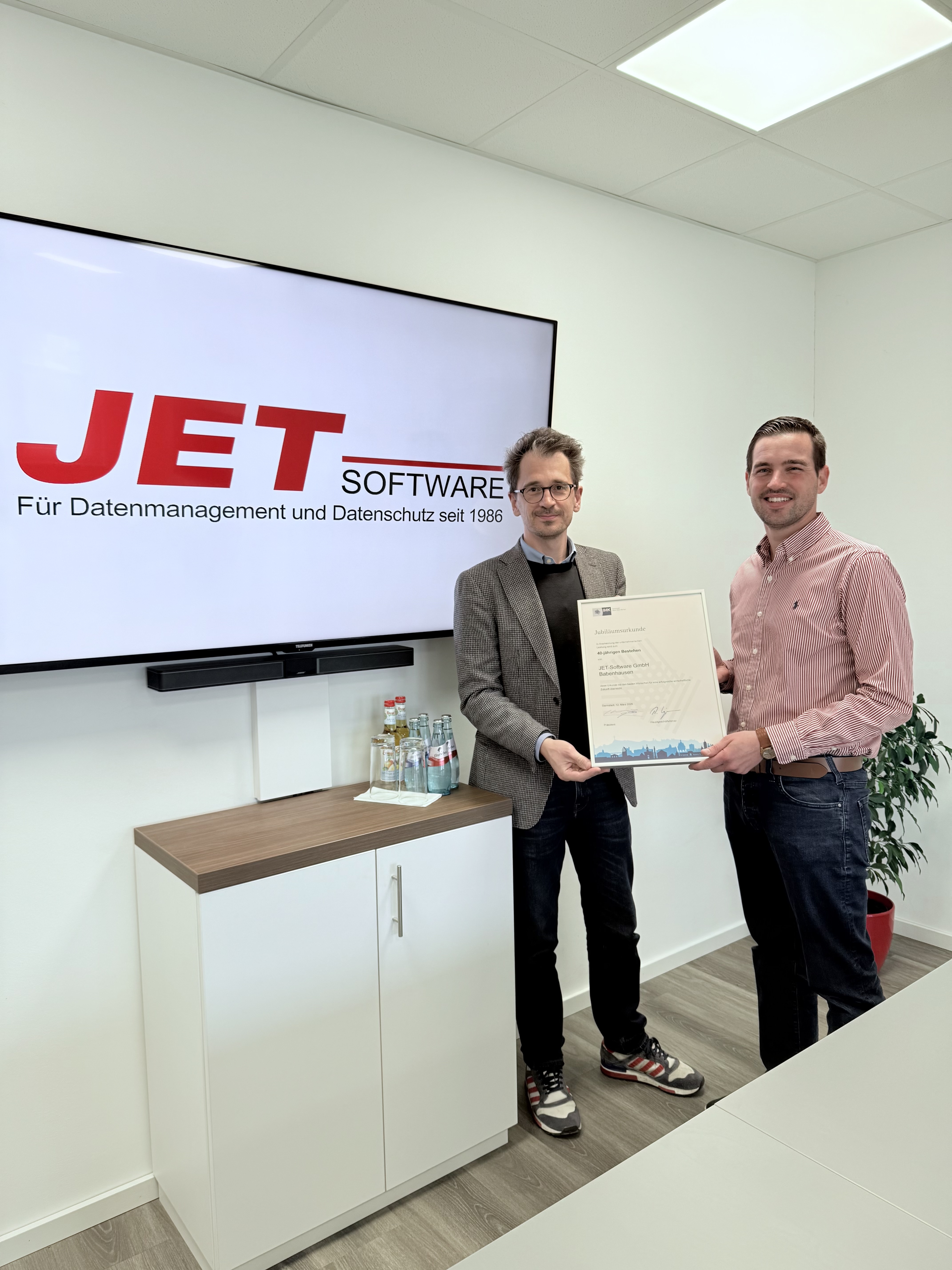 The Darmstadt Chamber of Industry and Commerce recently congratulated Jet-Software on its 40th anniversary, as well as its managing director Amadeus Thomas (right), emphasising the particular significance of this rare, long-standing experience in enterprise IT.