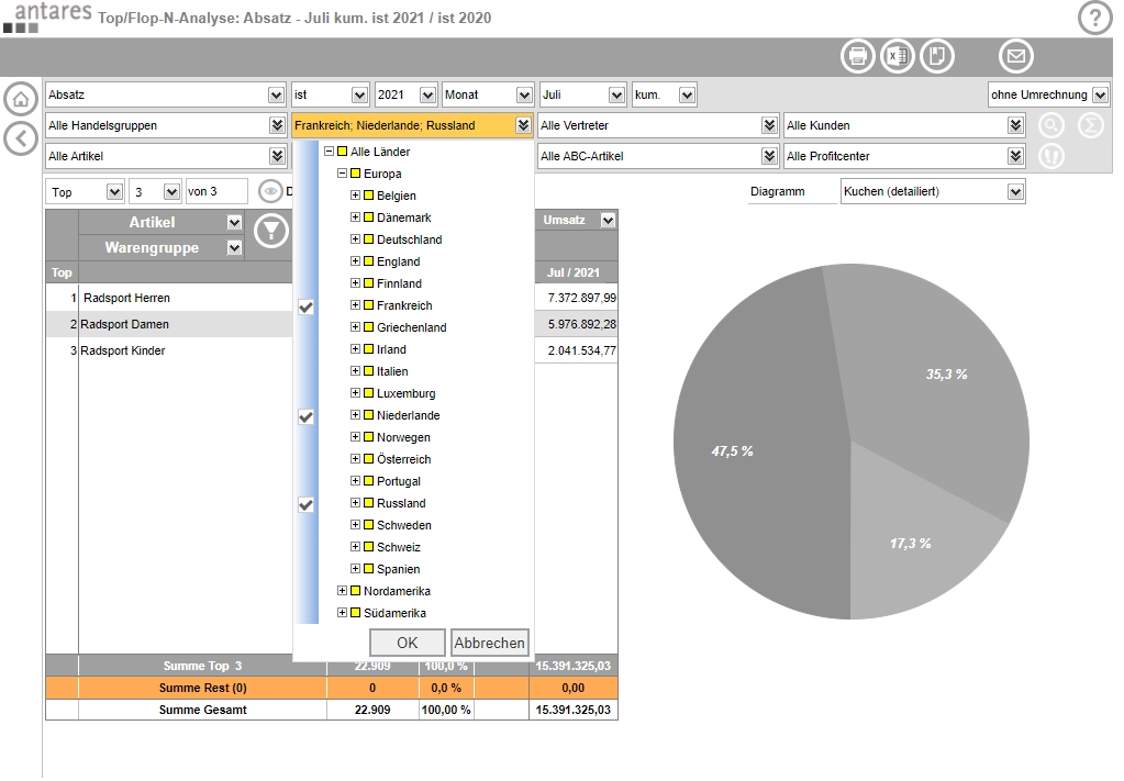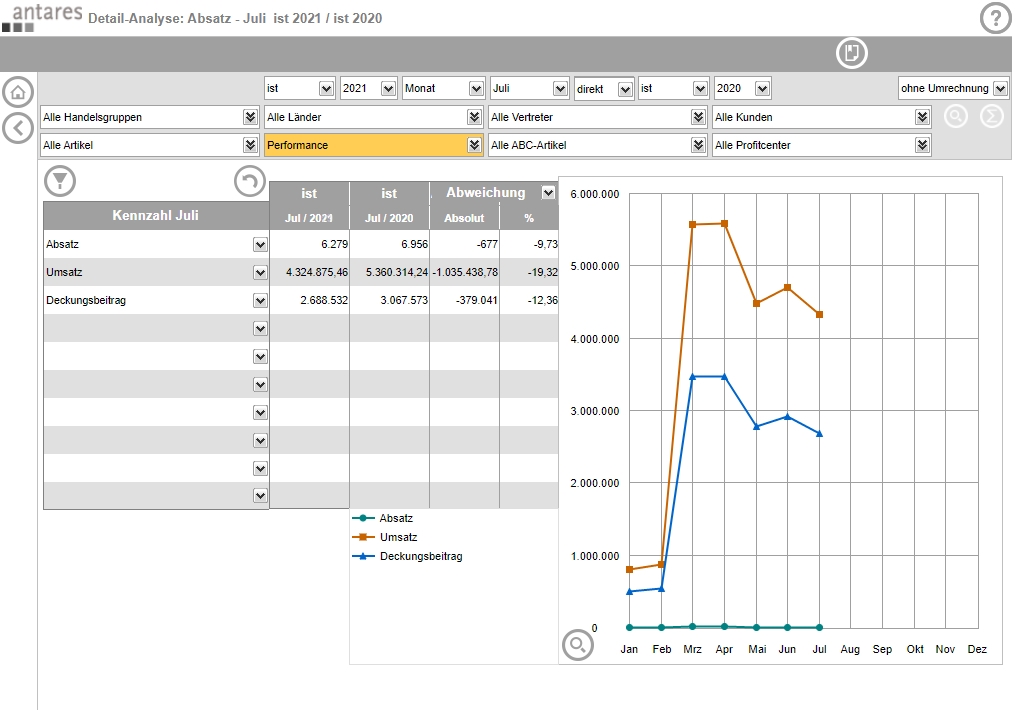Compile your analyses, reports and dashboards according to your own ideas and create meaningful evaluations and key figure comparisons based on existing information. Thanks to the web-based functions of the Antares Analyzer, users worldwide can access a uniform information base. This enables any number of users, regardless of their location and time, to participate in ongoing projects.
