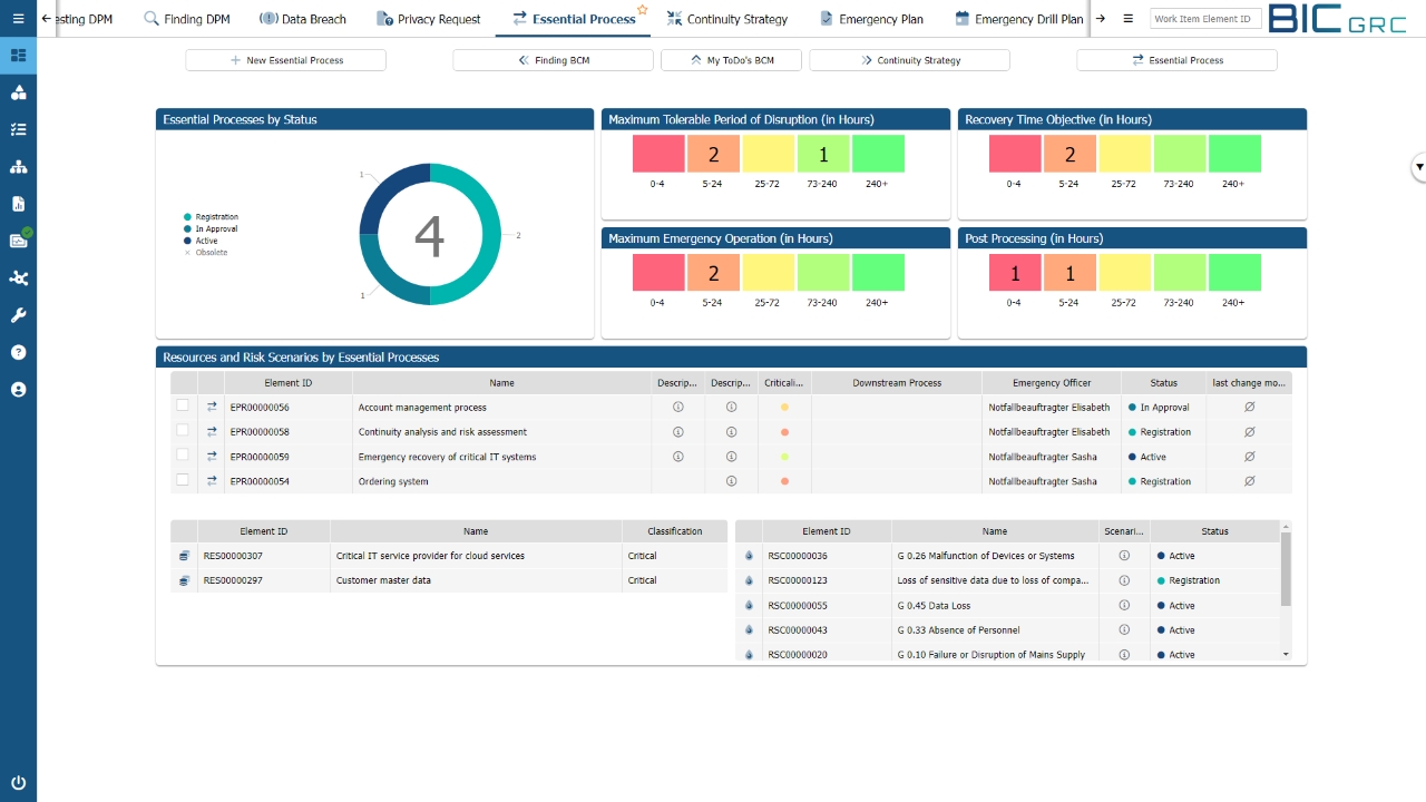 With BIC Business Continuity, you can ensure that your critical business processes are reliably identified and monitored. Prevent incidents in advance wherever possible and define failure scenarios for emergencies. Should a crisis situation occur, BIC Business Continuity supports you in dealing with and overcoming the incident as quickly as possible.