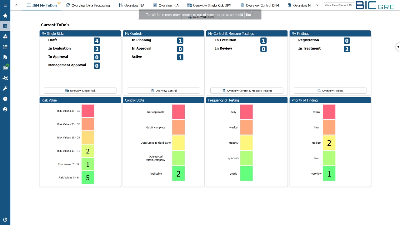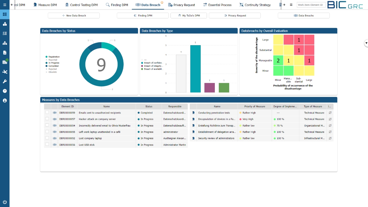 Master all EU GDPR challenges and legal requirements with BIC Data Protection. Digitize your data protection processes through standardized risk analyses and data protection impact assessments and create maximum transparency through a wide range of reports to manage the extensive reporting requirements in a resource-saving manner.