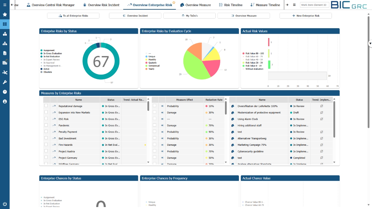 Optimize your company-wide risk management with BIC Enterprise Risk, which forms the basis for your successful governance, risk and compliance strategy. The intelligent, digital solution allows you to maintain an overview of the risk situation in your company and ensures full compatibility with common ERM standards. Rely on state-of-the-art technology to assess risks and define measures intuitively and quickly.