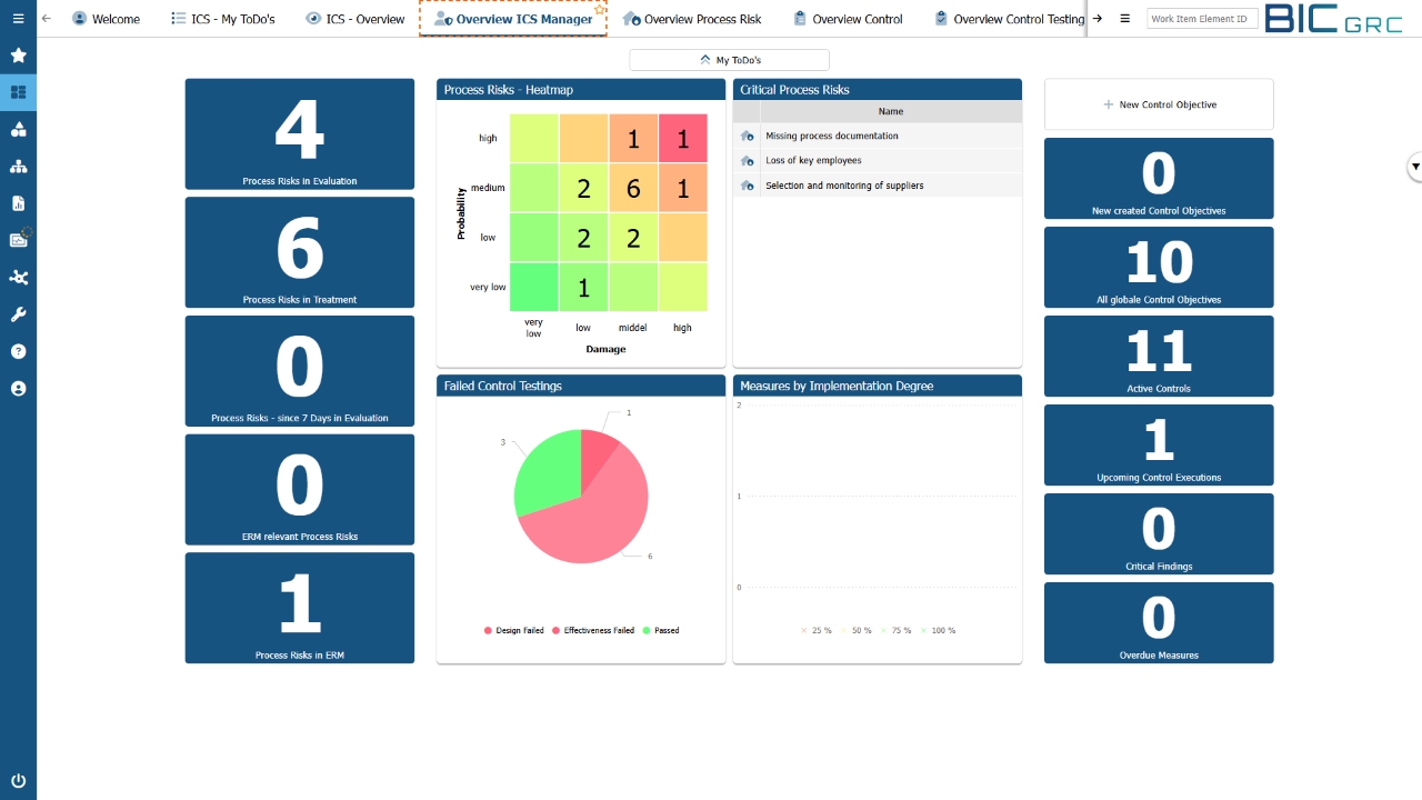 Maintain an overview of all controls and measures in your company with BIC Internal Control. Our workflow-based tool enables the professional management of process risks and controls. With an ICS that can be implemented quickly, your company will be strengthened in no time at all and you will make the day-to-day work of everyone involved in the process easier with the help of innovative ICS-specific functions and reports.
