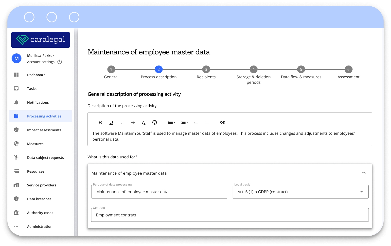 Data privacy responsibility means adhering to complex regulations like the GDPR, communicating effectively between departments, and meticulously documenting processes. This is where caralegal comes in: our platform serves as a central hub for all your data privacy needs. It brings order to the data organisation and is designed to be so intuitive that even non-lawyers can use it effortlessly.