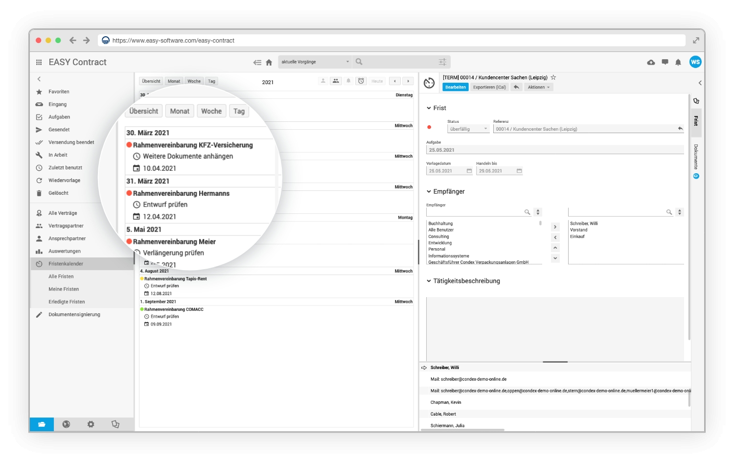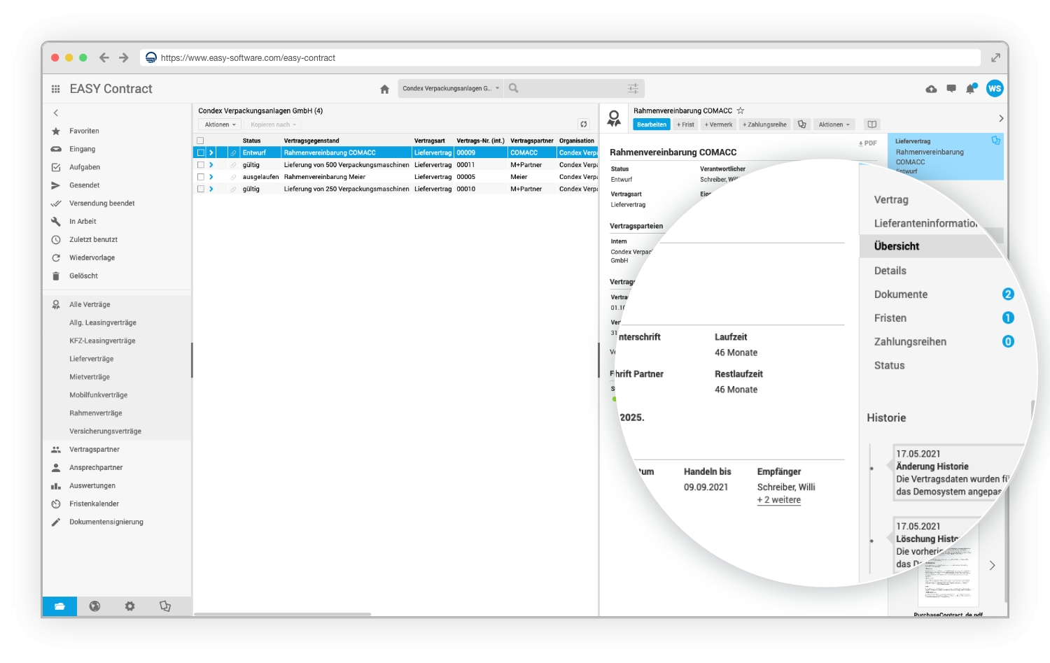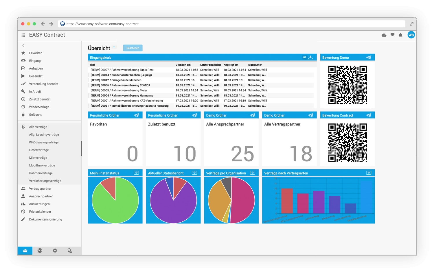 Contracts with the associated data, facts and files are part of a company's daily administrative work. However, this task area is typically very complex and labor-intensive. With EASY Contract, however, you have a web-based and modern system at hand with which you can centrally manage and process contracts without losing or overlooking important information. Thanks to the software's multi-client capability, you can create a workspace for the respective processors in your company with a standardized and quickly retrievable information status that can be called up on a daily basis.