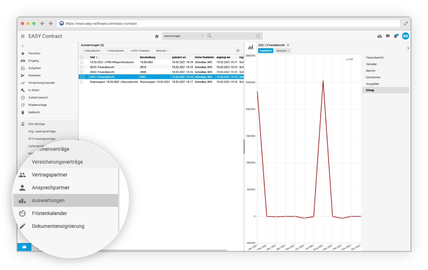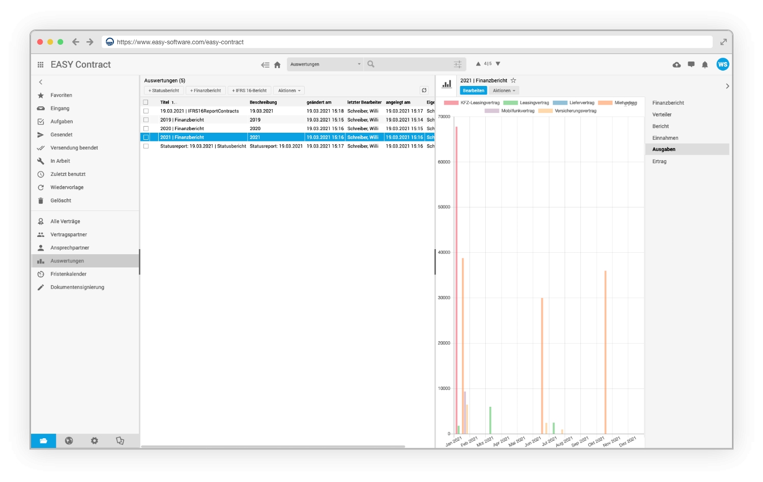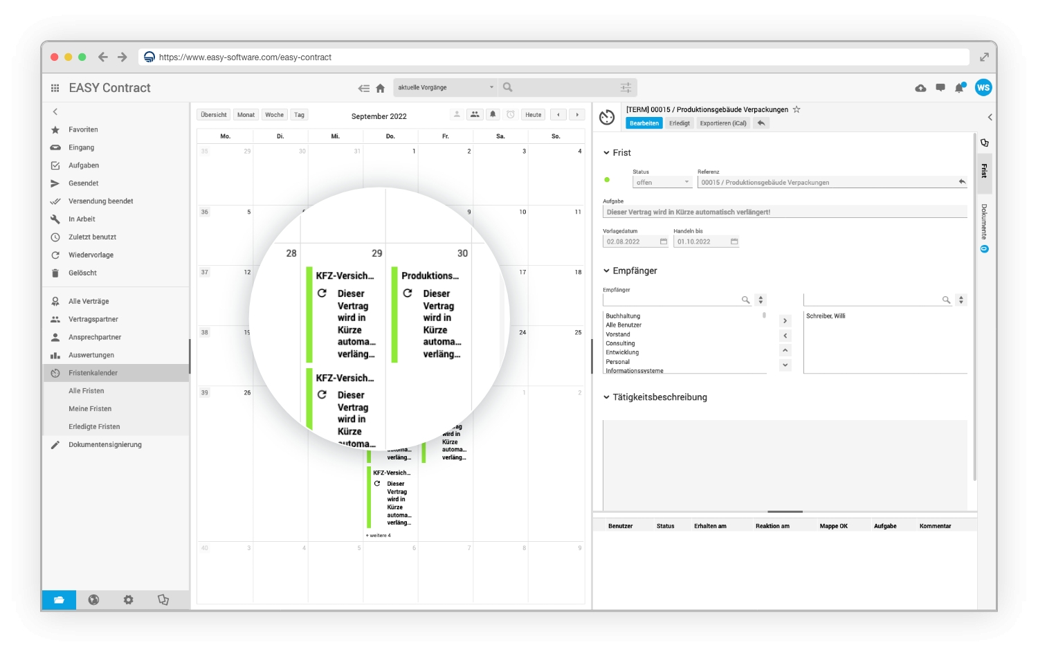 Contracts with the associated data, facts and files are part of a company's daily administrative work. However, this task area is typically very complex and labor-intensive. With EASY Contract, however, you have a web-based and modern system at hand with which you can centrally manage and process contracts without losing or overlooking important information. Thanks to the software's multi-client capability, you can create a workspace for the respective processors in your company with a standardized and quickly retrievable information status that can be called up on a daily basis.