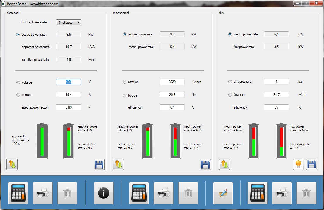 Calculates the power from the electrical supply via the mechanical shaft to the material flow, taking into account the individual efficiencies.
