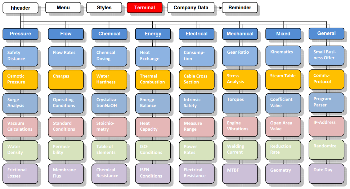 48 individual calculation programs for the areas of pressure, flow, chemistry, energy, electrics and mechanics