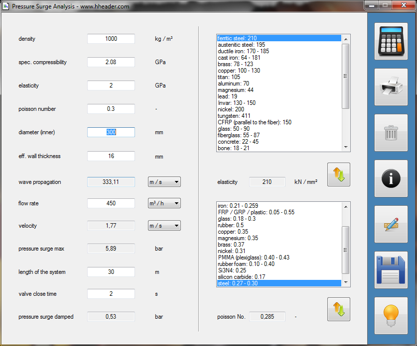 Estimation of the maximum pressure pulse in a pipe system based on pressure surges according to Nikolai Joukowsky, including consideration of valve closing times.