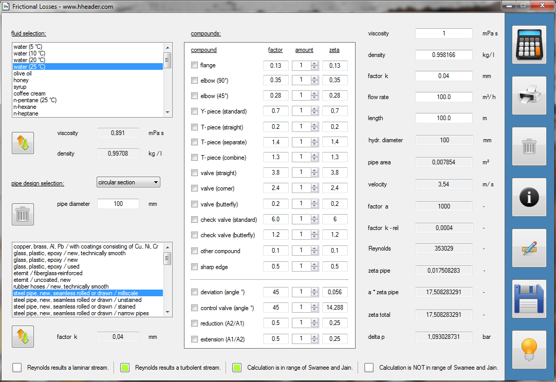 Calculates the pressure loss due to pipe friction for round profile piping and rectangular ducts using the Swamee and Jain approximation.