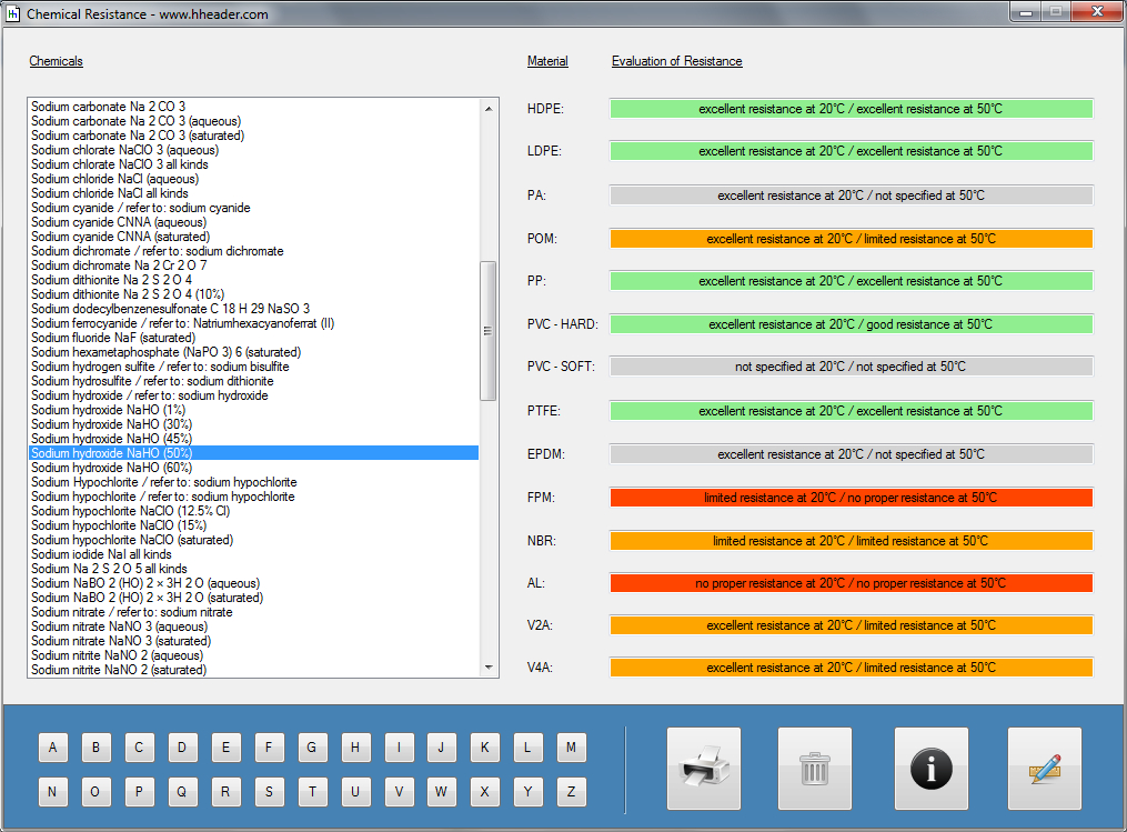 The resistance to selectable chemicals for 2 different temperature ranges is displayed for various materials.