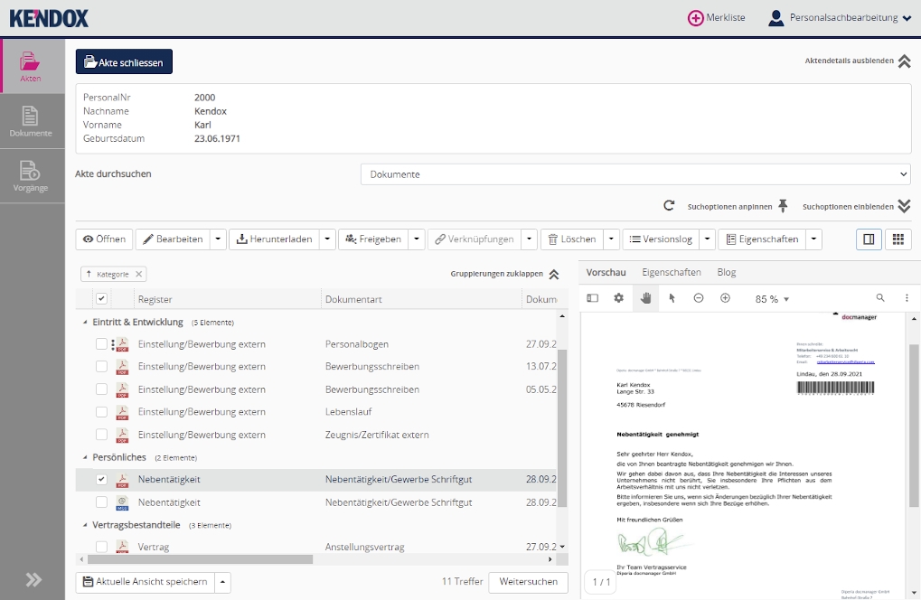 Freely configurable digital files and dossiers (e.g. personnel, contract, customer/supplier files) and flexible metadata management ensure order and fast searches. This means that documents and processes are traceable across all locations, clearly versioned and transparently accessible at all times - with approval and release processes if required.