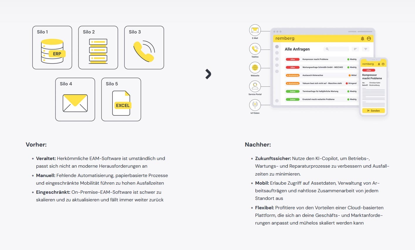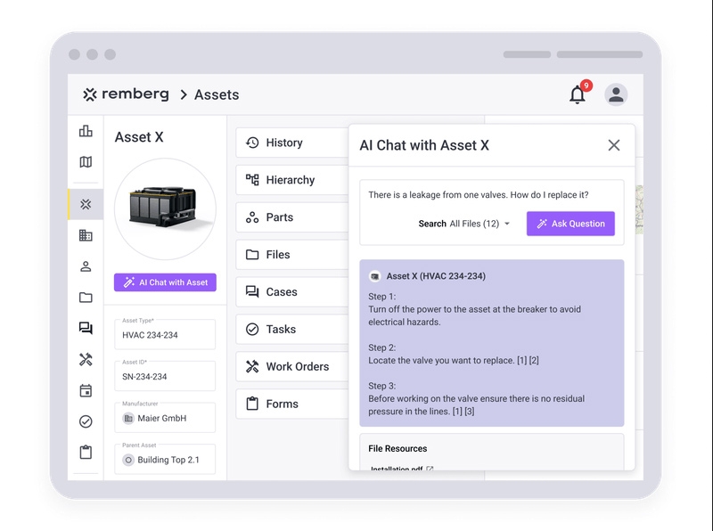 remberg - Enterprise Asset Management (EAM) Software is a modern, cloud-based EAM solution that allows you to centrally manage your machines, systems, operating resources and equipment throughout their entire life cycle and consistently digitalize maintenance processes. Instead of islands of information, paper files or Excel lists, you get a standardized database with 360° transparency: from location and plant structure to the history of individual components, everything is logically structured, quickly filterable and available at any time - in the office as well as directly on site.