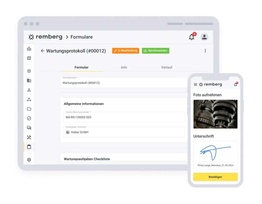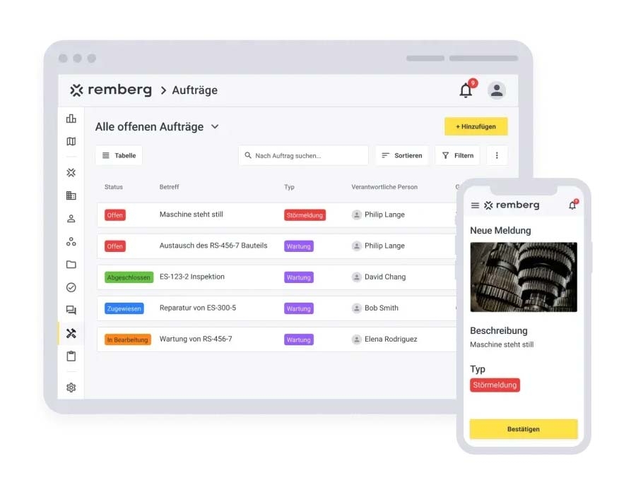 remberg - maintenance software is a modern, cloud-based CMMS solution (Computerized Maintenance Management System) that allows you to plan, control and seamlessly document maintenance and servicing centrally. Instead of Excel lists, paper folders or scattered information, everyone involved works on a shared platform - both in the office and directly at the plant using a mobile app. This allows you to keep track of machines, systems, equipment, work orders and spare parts at all times.