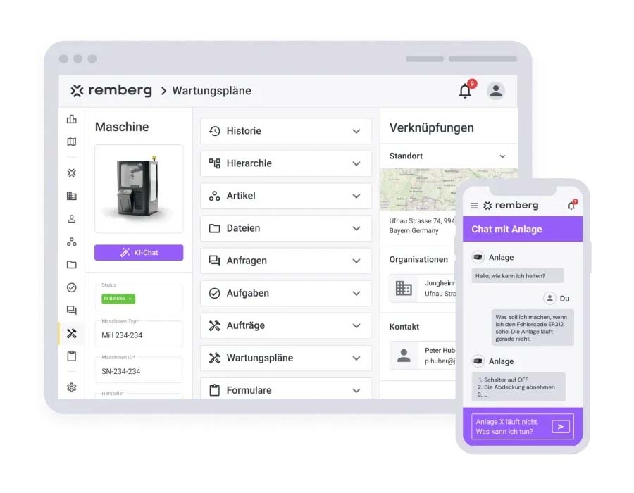 The integrated AI co-pilot provides particular added value: it supports your team in the event of malfunctions, answers questions in natural language and helps to save knowledge and make it retrievable. From quick fault reports and structured order processing to audit-ready evidence, remberg bundles all relevant information in a digital history - including photos, measured values, checklists and reports.