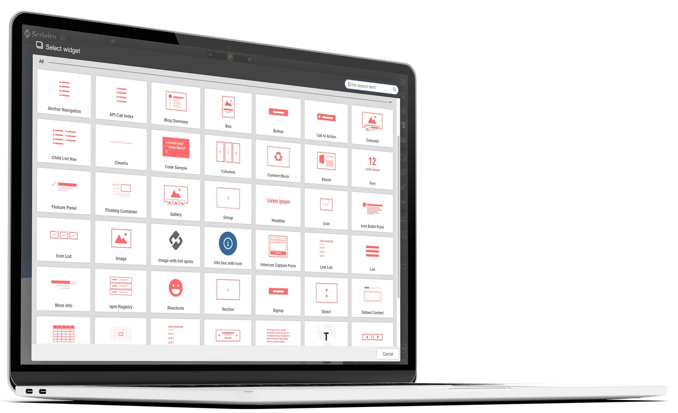 You can implement all specific requirements thanks to the included widgets. Scrivito already comes with ready-made examples including many widgets. However, if you need a new widget component, you can develop it in just a few minutes and make it immediately available to your entire team.