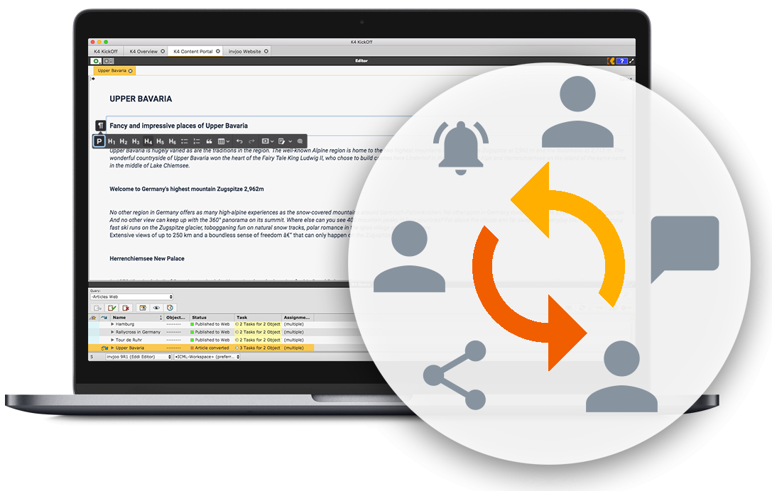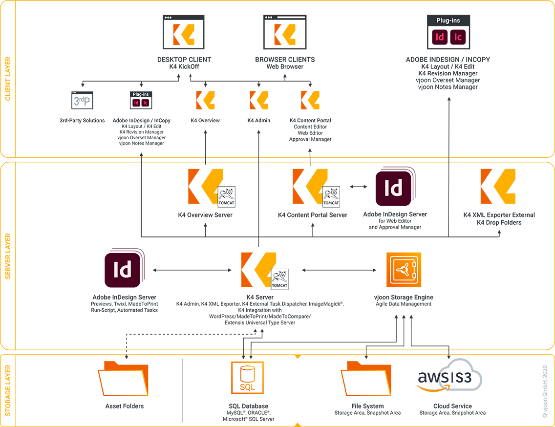 vjoon K4 speeds up your editorial and design workflow. vjoon K4 is a database-based publishing platform connected to Adobe Creative Suite, which allows everyone involved in the process of newspaper, magazine, corporate publishing, tablet or Web portal production to work on InCopy® and InDesign® documents simultaneously. Particularly beneficial: the new content editor of version 10.