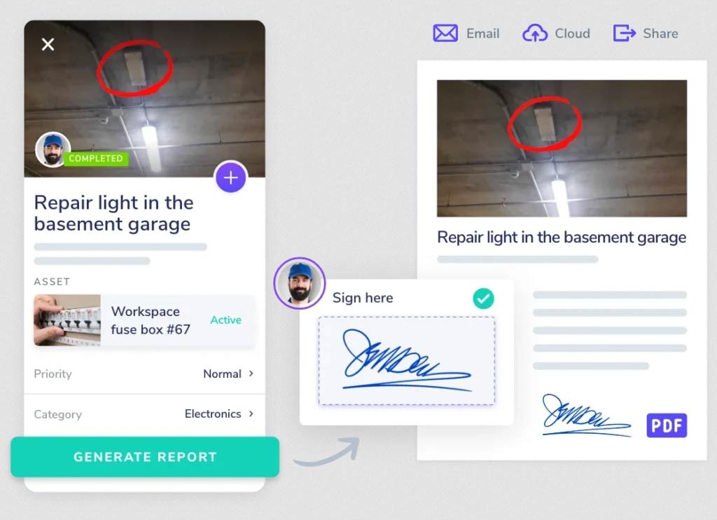 PDF reports & proofs: Create reports in just a few clicks, personalize (e.g. content/images), integrate mobile signature and logo; send by email or store in existing systems (e.g. ERP/DMS/CAFM)