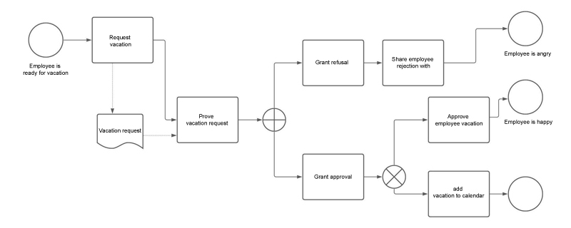 A typical example of a workflow is the vacation request. An employee starts the workflow process by going to the Self-Service Portal and clicking on "Request leave". The leave request is then recorded via a form. Once the form has been completed, the request is automatically forwarded to the employee's supervisor. If the request is approved, it is forwarded to the HR department, where it is checked whether the relevant remaining vacation days are still available. If this is the case, the corresponding vacation days are recorded in the personnel department. If the supervisor does not approve the leave, a notification is sent back to the applicant. If there are not enough vacation days left, a message is also sent back to the applicant.